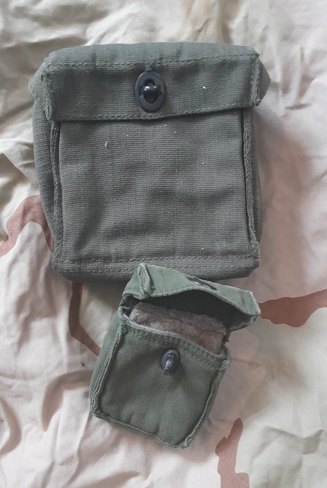 Brittien vanhempi ja kovin keräilykelpoiseksi pikavauhtia rynnivä Pattern 58 varustekokonaisuus piilotteli sisällään näitä varsin harvinaisia, n. 8-10mm paksulla villahuopa/-vanu kerroksella pehmustettuja taskuja. Taskuja saapui kahdessa koossa (maltillisesti täytettyjen taskujen mitat alla) ja pienempi on ilmeisesti tarkoitettu taitettavalle kompassille ja isompi mahdollisesti manuaaliselle laskukiekolle, merkinantolaitteelle tai pienille kiikareille.